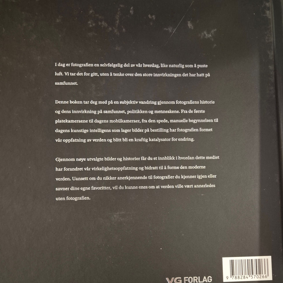 "Fotografien forandrer verden" I dag er fotografien en selvfølgelig del av vår hverdag, like naturlig som å puste luft. Vi tar det for gitt, uten å tenke over den store innvirkningen det har hatt på samfunnet. Denne boken tar deg med på en subjektiv vandring gjennom fotografiens historie og dens innvirkning på samfunnet, politikken og menneskene. Fra de første platekameraene til dagens mobilkameraer, fra den spede, manuelle begynnelsen til dagens kunstige intelligens som lager bilder på bestilling har fotografien formet vår oppfatning av verden og blitt bli en kraftig katalysator for endring.