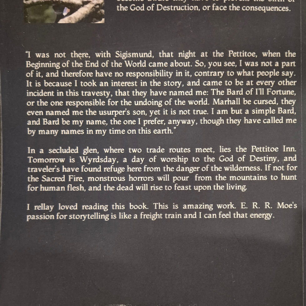 "I was not there, with Sigismund, that night at the Pettitoe, when the Beginning of the End of the World came about. So, you see, I was not a part of it, and therefore have no responsibility in it, contrary to what people say. It is because I took an interest in the story, and came to be at every other incident in this travesty, that they have named me: The Bard of I'll Fortune, or the one responsible for the undoing of the world. Marhall be cursed, they even named me the usurper's son, yet it is not true. I am but a simple Bard, and Bard be my name, the one I prefer, anyway, though they have called me by many names in my time on this earth." In a secluded glen, where two trade routes meet, lies the Pettitoe Inn. Tomorrow is Wyrdsday, a day of worship to the God of Destiny, and traveler's have found refuge here from the danger of the wilderness. If not for the Sacred Fire, monstrous horrors will pour from the mountains to hunt for human flesh, and the dead will rise to feast upon the living. Author of the historical fantasy series, Kingship, Egil R. R. Moe turns to pure fantasy.